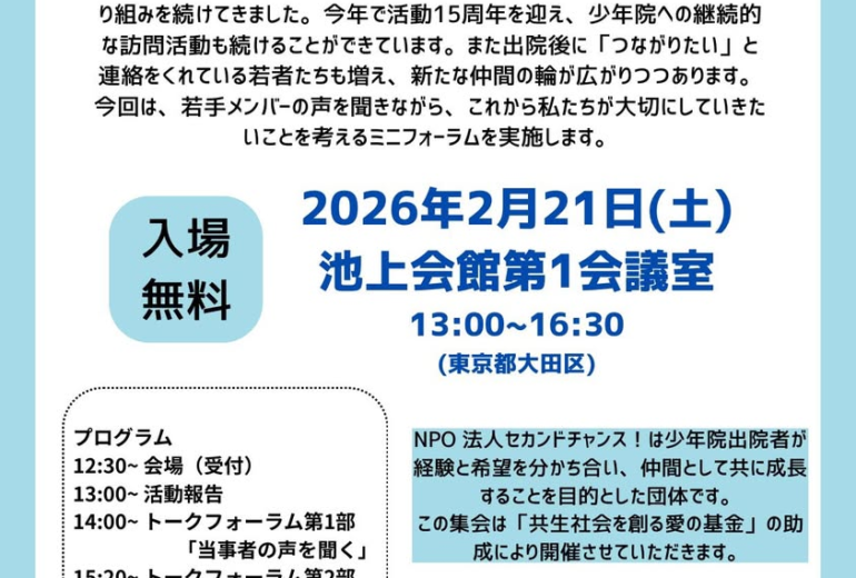 人間はすぐに変わることはできません。少年院や刑務所を出たからといって、2度と悪いことをしないとは言い切れません。それでも、何かに困った時には相談される1人になれたらいいなと思い活動をしています。